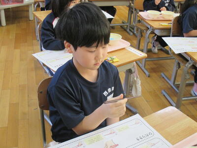 今日は、中学校栄養教諭の山口先生といっしょに「おはしの上手な持ち方、使い方」について学習しました。