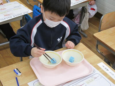 2024年1月29日 13時31分今日は、中学校栄養教諭の山口先生といっしょに「おはしの上手な持ち方、使い方」について学習しました。