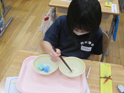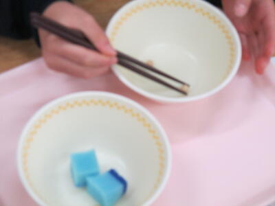 持ち方の学習の後は、「つまむ」練習です。給食の食器の中に入った「スポンジ」「大豆」をつまんで、右へ、左へ・・・