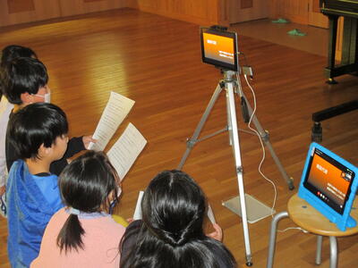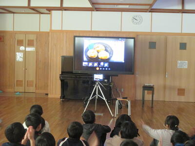 2024年2月7日 12時28分今日は、豊間小学校とのオンライン交流の日です。ホールに入ってみると緊張気味の4年生がいました。