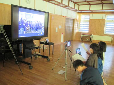 作成した写真などのスライドと音声は別のタブレット機器で行いました。西会津小学校のこと、西会津の自然、偉人などの他に、猪苗代湖等、会津のことも伝えました。