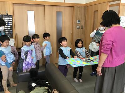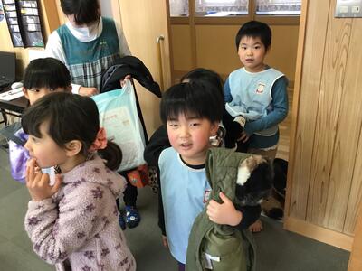 1か月後には、ピカピカの1年生になるひまわり組のみなさん。今年度は、4回に分かれて「お手紙ゆうびん」をしてくれました。元気のよいあいさつで、いざ校長室へ。今日は、こども園だよりの他に、先日の体験入学のお礼のお手紙も届きました。体験入学の感想を聞くと、「めっちゃ、楽しかった!」とのこと。小学校のみんなで、待っていますよ!