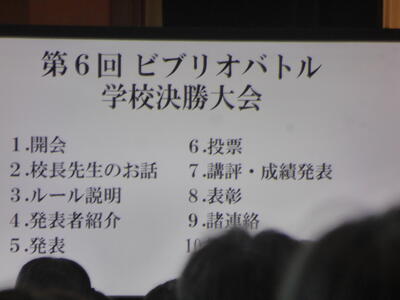 ビブリオバトルとは、自分の選んだ本のすばらしさを伝え合うものです。中一から中三までの6名が5分間で本の紹介をしました。6年生は、最後に投票をタブレットで行いました。質問も積極的にするなど意欲的な態度はすばらしかったと褒めていただきました。