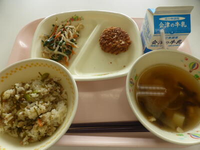 2024年9月19日 14時35分今日のメニューは、切り昆布のまぜごはん、きくらげスープ、にらのおひたし、メンチカツ、牛乳でした。