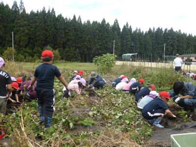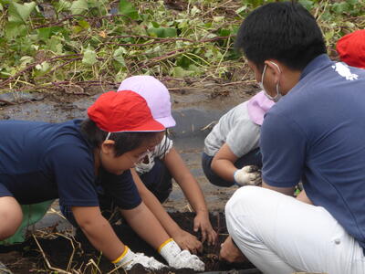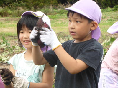 今日は、架け橋プログラムとしてひまわり組さんと一緒にいもほりです。掘っても掘ってもいもが出てきません。ようやく、見つけました。「あったー!」と大喜びです。「虫もいるね」と話している児童もいました。