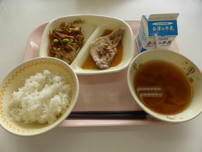 今日のメニューは、ごはん、じゃがいもの味噌汁、豚肉の南蛮焼き、きんぴらごぼう、牛乳です。