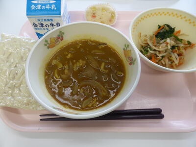 今日のメニューは、カレーうどん、切り干し大根のおかかあえ、みそと野菜の蒸しパン、牛乳です。