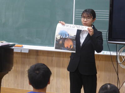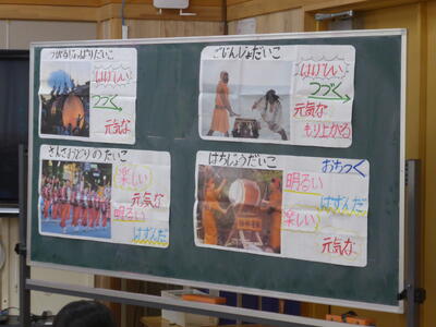 2024年11月25日 13時22分音楽の授業です。題材名は「おまつりの音楽をつくろう」です。子ども達はおまつりが大好きです。おまつりのリズムは日本人に合ったものだといわれて久しいですが、2年生が伝統的なおまつりのリズムで机をたたいているのを見ると、現代でも言えることだと思いました。