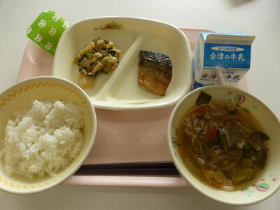 2024年11月25日 13時27分今日のメニューは、ごはん、沢煮わん、さばのしょうゆ焼き、白菜と油あげのだし煮、ものゼリー、牛乳です。