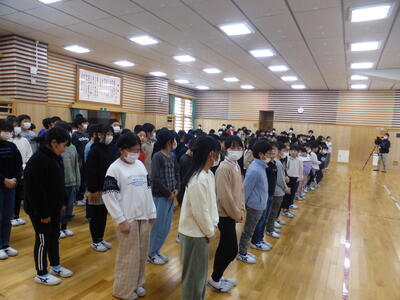 2024年12月23日 10時34分学級閉鎖を終えて5年生が学校に戻ってきました。朝の5年生の様子は、友達と嬉しそうにおしゃべりしていました。第2学期終業式では、校長講話「ノーベル平和賞受賞と平和」、生徒指導担当から「冬休みの過ごし方」について話をしました。