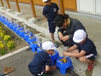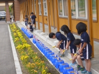 見ていると、青いプラスチックの植木鉢に一楽しそうに水をかけています。 昨日朝顔の種をまいたので、みんな一生懸命です。 「早く芽を出してね~。」と声をかけている子もいました。 お家でも、芽が出たかどうか聞いて成長を共に喜び合ってほしいと思います。 ちなみに、さゆり学級の3名は先週種をまいたそうで、すでに双葉が顔を出しています。 うれしそうに水をあげていました。