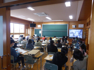 今日は中学校での生活を体験する日です。中学校の生徒昇降口から入り、中学校三年教室に入りました。