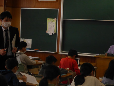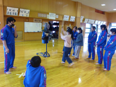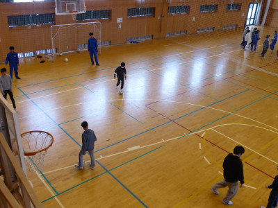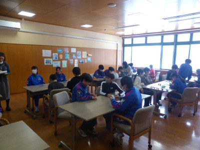 三年生が卒業し、空いた教室にお借りしての授業です。授業は、阿部先生や教頭先生、佐藤先生が担当しました。給食もその教室で食べて、いよいよ午後は部活動体験となります。