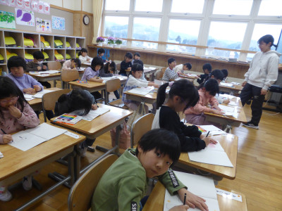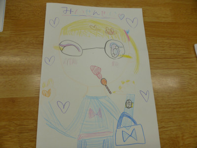 一年生は今日も全員が登校することができました。教室を見てみると、お絵かきをしています。好きなものを書いていました。「園長先生!これ見て!」と言われ、確かに似ているなと思いながら近寄っていくと、描いたイラストの説明をしてくれました。画像は、担任の先生をえがいたものです。うまいなあ!