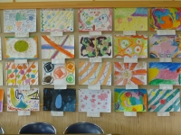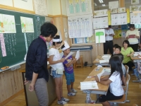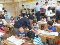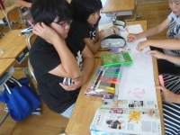 今日の午前中5年生の図工の授業を見たのですが、その作品掲示の「見出し作り」が昼休みに行われていたのでそちらを紹介します。 「“夏”といえば何ですか?」という唐突な質問から始まり、「スイカ。」と答えると「もう描いてあるので別なのを。」とリクエスト。 「海水浴」と答えると浮き輪を描き出しましたが、思わず「ドーナツみたい。」と失礼な発言をしてしまいました。 笑って許してくれましたが・・・。 かわいい5年生であり、楽しい昼休みのひとときです。 児童と触れ合う機会の少ない私としては、校舎内でのささやかな会話が貴重なものとなっています。(4人一緒の写真がぼけてしまいました。〇〇さん、一人だけ顔が写らずごめんなさい。)