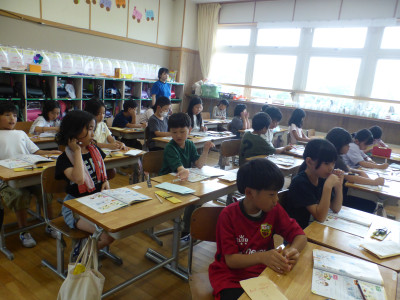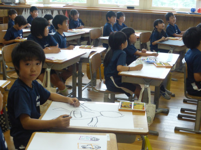 1学期の思い出を振り返って絵に表しています。低学年の子どもたちの絵はおもしろいです。
