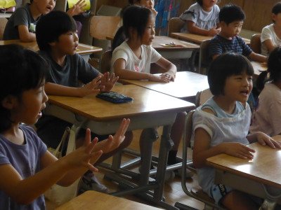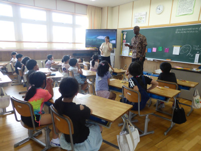 1年生は、教務主任の先生とALTの先生といっしょに外国語に興味を持てるように楽しい活動をしていました。色の呼び方や数について学びました。なかなか発音が上手ですね!