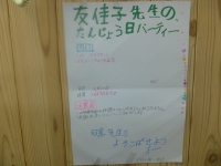 話は変わりますが、帰り際に、心がほんわか温かくなる張り紙がありました。 「友佳子先生のお誕生日パーティー」を行うお知らせでした。 『目黒先生をよろこばせよう オ~』の言葉が、私にはたまらなくうれしく感じられました。 優しいね!