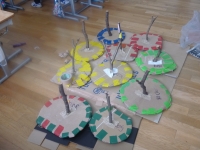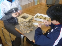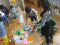 今日の3校時と4校時の間の休み時間、授業を参観するために4年教室に向かっていると、何やら張り切っている声が聞こえてきます。 1年生でした! 来週水曜日、保育所年長組の「来年度新入生」が体験入学にやってくるので、その準備を楽しそうに行っていたのです。 教室やラウンジを使って、遊び道具を作ったり、メダルを作ったり、カルタを準備したりとみんな忙しそうに動いています。
