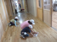 さて、西会津小では縦割り班(1年生から6年生まで混合の班)で清掃活動を行っています。 水曜日以外、13:40~13:55まで校舎全体を分担して掃き掃除、雑巾がけ等を行います。 みんな静かに一生懸命働きます。 雑巾がけなどは、先生や支援員の方々の教え通り、しっかりと膝を床につけて、力を入れて「から拭き」(汚れがひどい時は水拭き)をしています。 最近はフローリングの家が増えて雑巾がけの必要もないのかもしれませんが、学校では床にせよ棚にせよ基本(掃除の仕方、拭き方)をきちんと教えていきたいと思います。