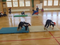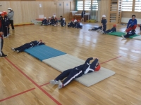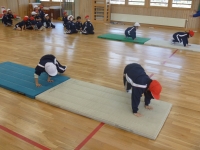 校内を回っていると、多目的ホールでブザー音と楽しそうな声がします。 行ってみると1年生がマットを敷いてその上をゴロゴロと回っていました。 ゴロゴロ回るといっても、前転とか後転ではなく、体を伸ばしてマットからはみ出さないように横向きに回転です。(写真をどうぞ!) 詳しくは分かりませんが、体を動かす基本動作や平衡感覚、楽しくマット運動を楽しむなどの目的に沿って行っていたと思います。 しばらくすると、マットに両手をつき、両足を跳ねるようにマットの両側に出す動作をしていました(こちらも写真をどうぞ!)。 低学年では、「マット遊び」とか「リズム遊び」といった、遊びを体験して体を動かす楽しさを学ばせることが大切なのです。 本田先生を中心に、山形先生、本間先生が体育の基礎を身につけさせています。