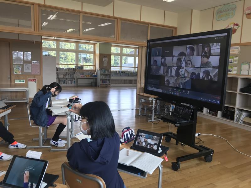 本日、分散登校2日目です。登校した友達と自宅にいる友達と一緒に健康観察と授業を行いました。