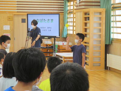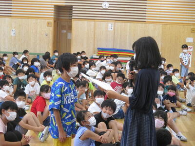 集会委員会の6年生は、「お魚博士になって何を研究したいですか」「好きな魚は何ですか」などと、アドリブでインタビューを続けました。相手の答えから次の質問を考えてインタビューできたところは、さすが6年生でした。