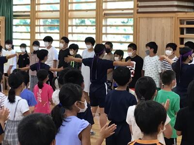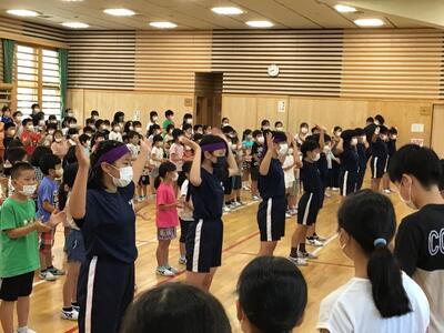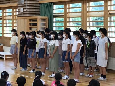 2022年7月14日 17時40分7月22日に行われる「会津坂下町・西会津町水泳記録会」の壮行会が行われました。参加するのは、6年生29名。5年生が応援団となりエールを送りました。