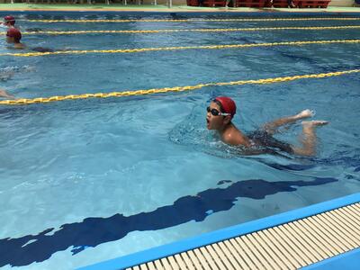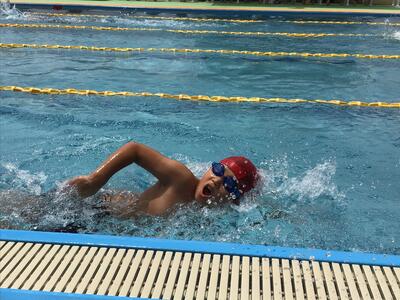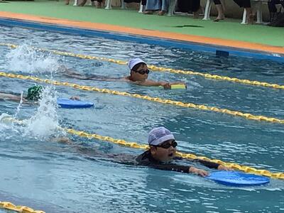 今週は雨マークだったのですが、本日は晴れ時々くもり。風があったので、プールに入った子供たちの中には、「さむーい」と話す子もいましたが、保護者の方もたくさんお見えになられ、熱気に包まれた水泳記録会になりました。