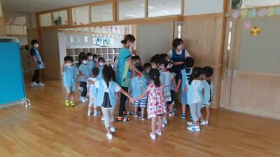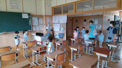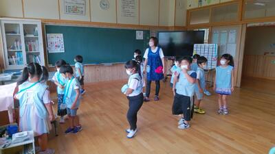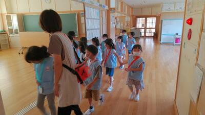 2022年8月5日 10時45分今日は、こゆりこども園の年長さんたちが、小学校の施設探検に来ています。小学校の普通教室は、すべて2階にあります。毎日階段を上り下りしますよ!