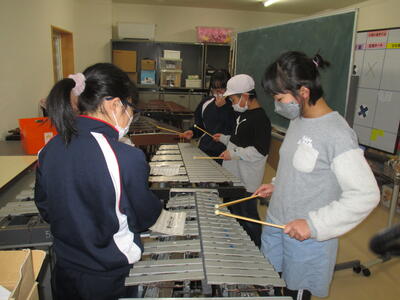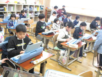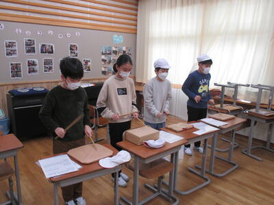 2023年1月26日 12時49分新鼓笛隊の役割分担が決定し、指揮や太鼓などの楽器の演奏を6年生から5年生へと引き継ぐ練習をしています。9月の鼓笛パレードでポンポンの演技をした3年生は、鍵盤ハーモニカの演奏を行います。授業時間以外にも6年生に指導してもらったり、お互いの動きや演奏を見合ったりして、上達してきました。