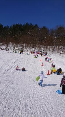 ひろーいゲレンデを使って、1人乗りや友達と2人乗りのソリで、坂を滑り降ります。思ったよりも傾斜があって、スピードもついて、スリル満点のソリのりでした。