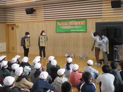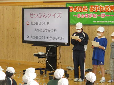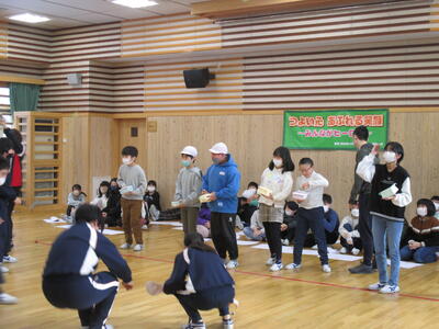 集会委員会が、「節分」の劇とクイズを行い、その後、年男年女の5・6年生が「あめまき」をしました。