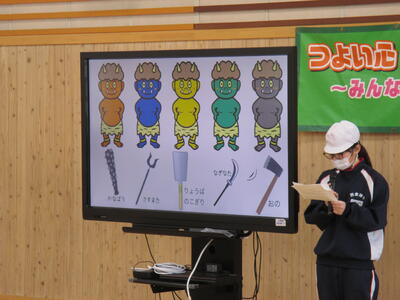 2023年2月2日 14時17分明日は、3~6年生がスキー教室に出かけるため、西会津小学校では1日早く「豆まき集会」を行いました。