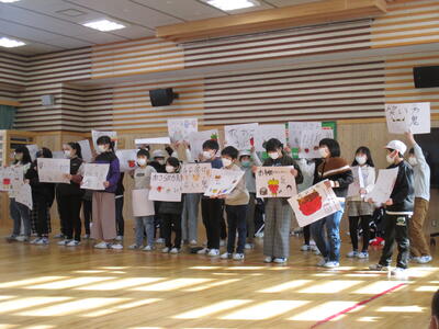 明日は、3~6年生がスキー教室に出かけるため、西会津小学校では1日早く「豆まき集会」を行いました。