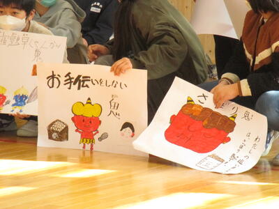 5年生は、追い出したい鬼を画用紙にかいて発表しました。