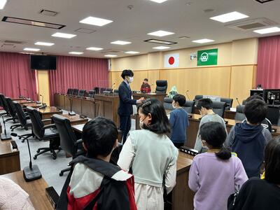 ここは、議場。広報誌やケーブルテレビで見たことはあっても、実際に入ったのは初めてです。一人一人の席に、「名前の札」と「マイク」がありました。