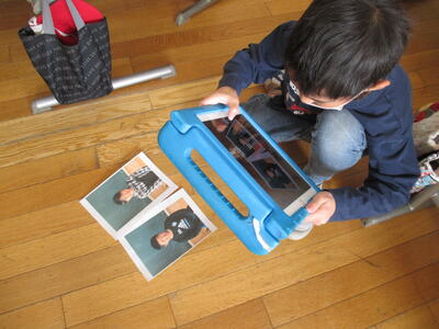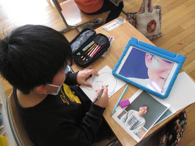 6年生といっしょに過ごす日も30日を切ってしまいました。お世話になった6年生に感謝の気持ちを込めて、各学年で様々な準備を進めているところです。今日は、1年生が、6年生の写真を見ながら似顔絵を描いていたのですが、そこでタブレット登場!写真を撮影し、それを拡大して参考にしようとひらめいたようです。6年生のみなさん、お楽しみにね!