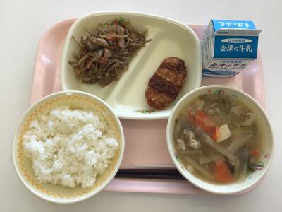 2023年2月17日 12時20分今月の「食育の日献立」では、西会津小学校の星さん(1年)、渡部さん(6年)、清野さん(6年)が考案した「減塩具だくさんとん汁」が提供されました。写真でもお分かりかと思いますが、名前のとおり、豚肉、だいこん、にんじん、油揚げなどの「具」がたくさん入っています。