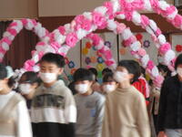 お花のアーチを通って、6年生の入場です。