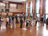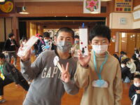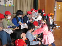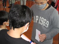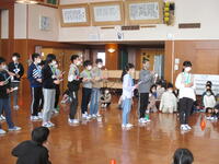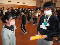 ③3年生は、人探しゲーム。3年生と6年生がペアになり、カードに書かれた人を探しに行きます。