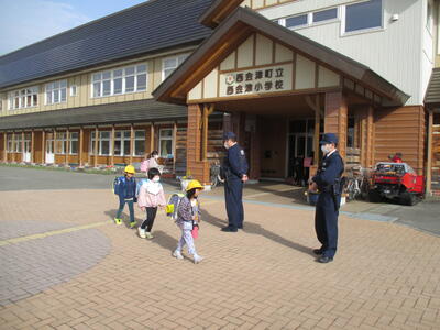 4月14日(金)の朝、小学校昇降口前で、あいさつ運動が行われました。久しぶりにお会いしたこども園の園長先生を見かけると駆け寄り、元気よく「おはようございます」とあいさつしていました。