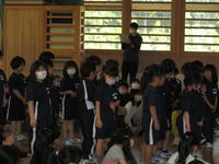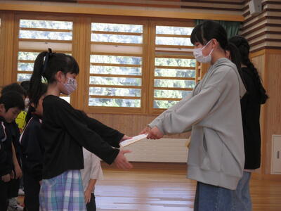 各学年のめあて発表に引き続き、「JRC登録式」を行い、代表委員から1・2年生に「赤十字のバッジ」が渡されました。JRCの研究校だった頃から引き続き、子どもたちは「気付き、考え、実行する」ということを意識して生活していました。今年もがんばりましょう。