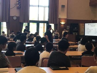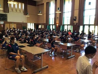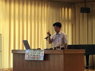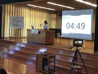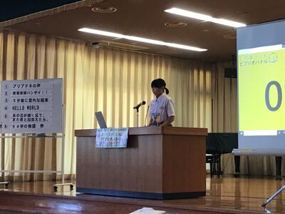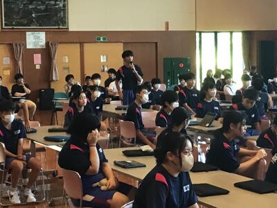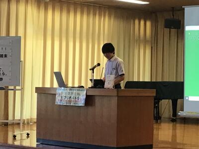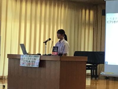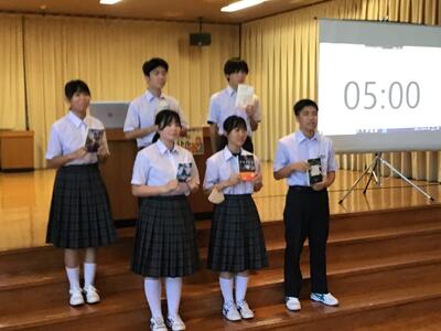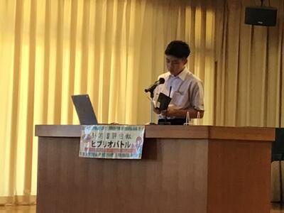 2024年9月4日 17時51分知的書評合戦ビブリオバトルの全校決勝大会がありました。ビブリオバトルは自分がすすめる本のよさを決められた時間内で発表するコミュニケーションゲームです。学級大会、学年決勝大会、全校決勝大会と段階を追ってビブリオバトルを実施していて、西会津中の特色であり伝統となっています。今日は、各学年の代表2名ずつ計6名が、地域の方々や西会津小6年生、全校生徒の前で堂々と発表しました。