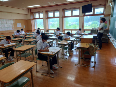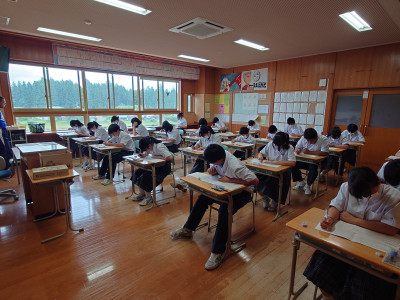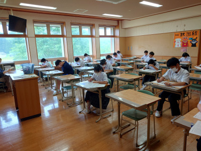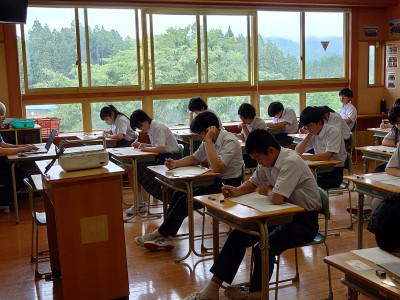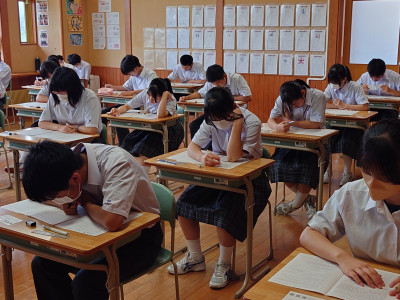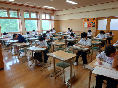 2025年6月24日 14時10分どの学年の生徒も、1点でも多く点数がとれるよう、ギリギリまで真剣に臨んでいるようすが見られました。特に、初めての定期テストとなった1年生は人数が多いため2つの教室に分けての受験となり、いつもと違った雰囲気で緊張感のあるテストとなりました。生徒たちは毎日の授業に加えて、デジタルドリル「ドリルパーク」や各教科の教科書やワークの問題練習、毎日の自主学習ノートなどを通して学習に励んできました。テスト後はできなかった問題を復習してできるようにすることが重要になります。テストが終わった開放感にひたるだけでなく、次の学習につながるようにテスト後の復習も大切にしてください。