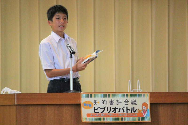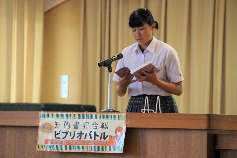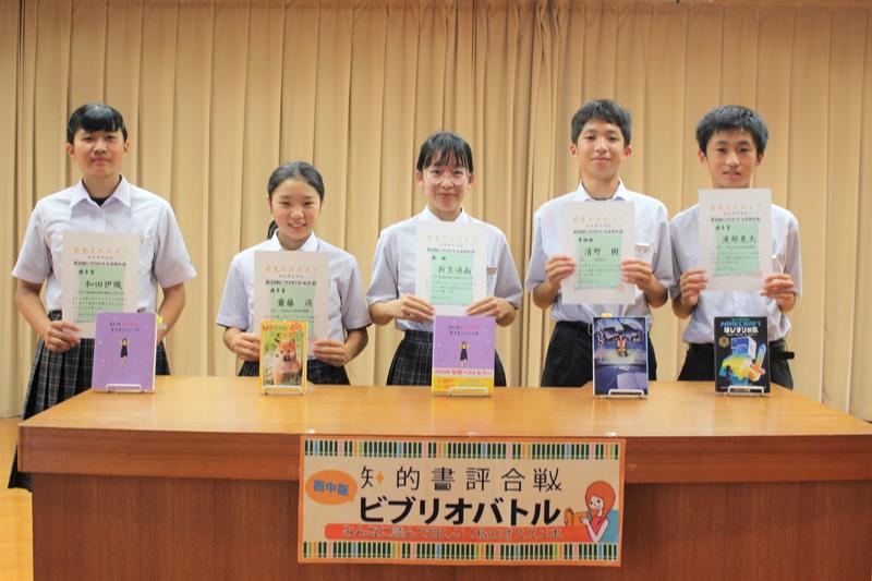 7月の学校予選を勝ち抜いた代表5名が全校生の前で、お薦め本について5分間のプレゼンを行いました。
