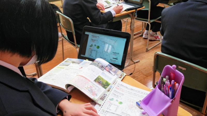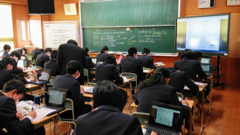 西会津町の積極的なICT環境整備により、本校では昨年6月に1人1台タブレット型PCが実現しました。その後も、校内LAN整備や全教室への電子黒板設置など、次々にICT環境が向上しています。