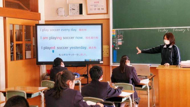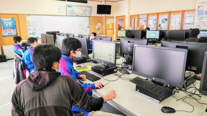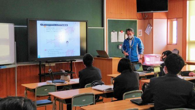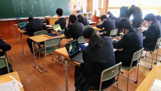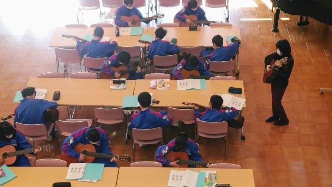 各教室をのぞいてみると、英語や数学の授業では電子黒板を活用して視覚的にもわかりやすい授業が行われていました。技術の授業では、タブレット型PCの使用について振り返りながら、各自で使用ルール一覧を作成していました。使用目的をしっかり認識しながら有効に活用してほしいと思います。国語の授業では、各自がタブレット型PCで言葉の意味など調べながら、振り返りの学習を進めていました。そして、音楽の授業では、ギターを一生懸命練習していました。例年の今ごろは卒業式に向けて式歌の練習を行っているのですが、コロナ禍で合唱ができない状況です。ギターに興味を持って、昼休みにも練習している生徒もいるようです。