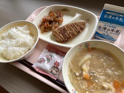 あとひきみそ大豆、こんにゃくのきんぴら、いわしのフライ、ごはん、ご汁、牛乳