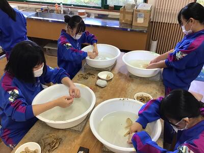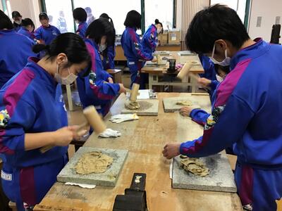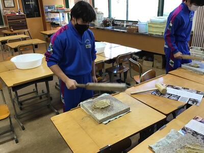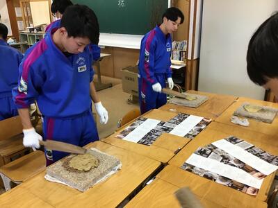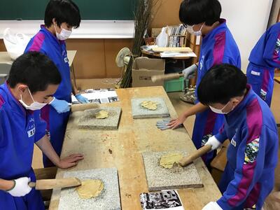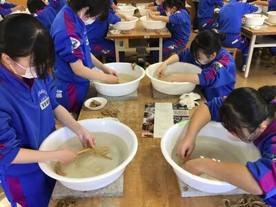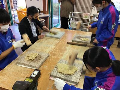 2023年11月9日 18時37分3年生が卒業証書となる和紙づくりを行いました。出ヶ原和紙職人の方々のご指導の下、まずは、煮た木の皮の不純物を手で根気よく取り除きました。そして、木の皮の繊維をより細くほぐすために、打ち棒でたたいて和紙の原料をつくりました。明日は、とうとう紙すきになります。